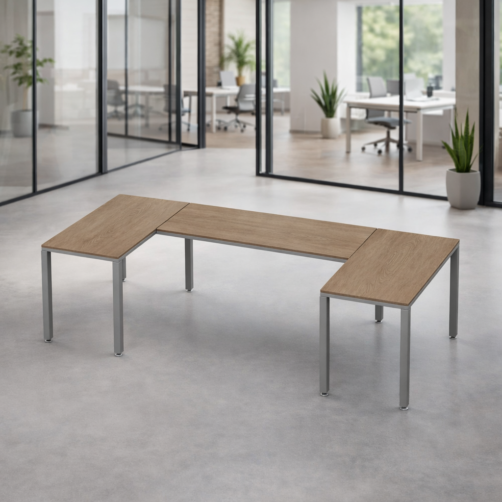 El escritorio en U conformada por 3 escritorios es ideal para un ejecutivo ya que permite una distribución eficiente del espacio, facilita la colaboración con otros compañeros y proporciona un entorno de trabajo versátil que puede usarse para reuniones, presentaciones y tareas individuales, todo al mismo tiempo.