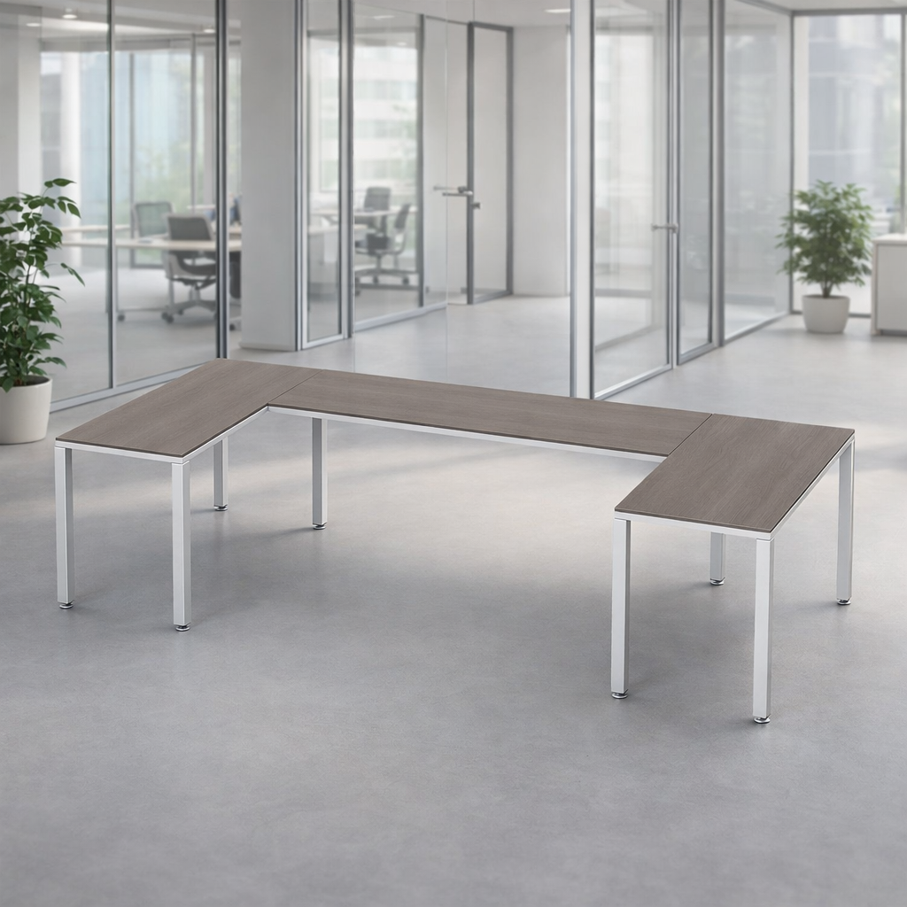 El escritorio en U conformada por 3 escritorios es ideal para un ejecutivo ya que permite una distribución eficiente del espacio, facilita la colaboración con otros compañeros y proporciona un entorno de trabajo versátil que puede usarse para reuniones, presentaciones y tareas individuales, todo al mismo tiempo.