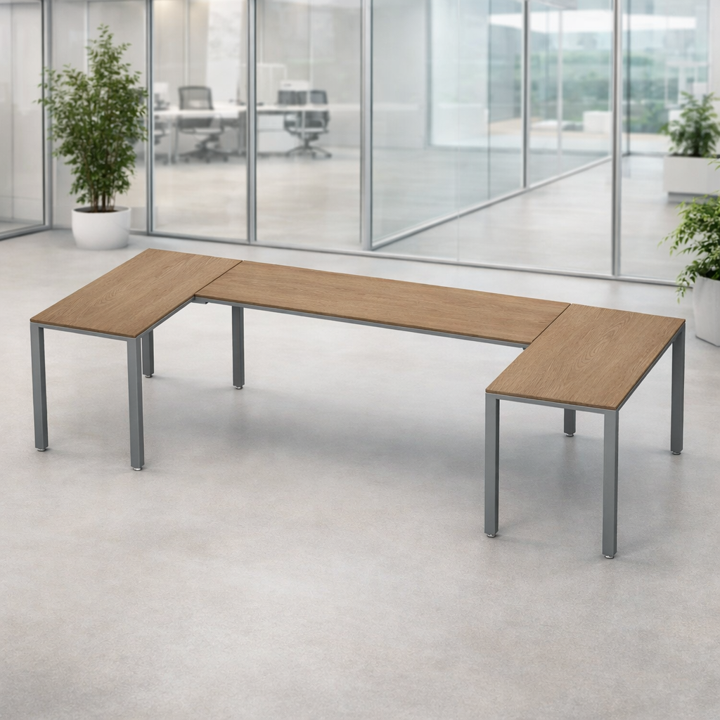 El escritorio en U conformada por 3 escritorios es ideal para un ejecutivo ya que permite una distribución eficiente del espacio, facilita la colaboración con otros compañeros y proporciona un entorno de trabajo versátil que puede usarse para reuniones, presentaciones y tareas individuales, todo al mismo tiempo.
