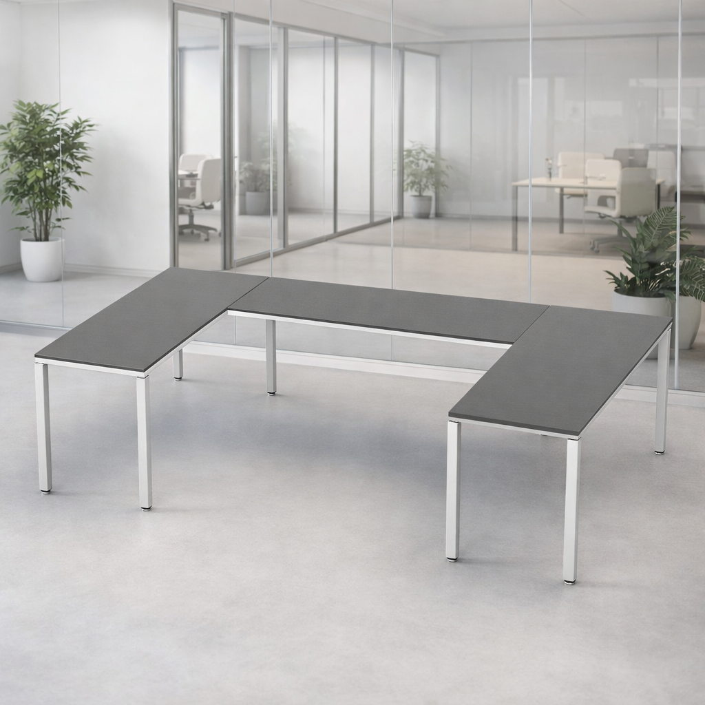 El escritorio en U conformada por 3 escritorios es ideal para un ejecutivo ya que permite una distribución eficiente del espacio, facilita la colaboración con otros compañeros y proporciona un entorno de trabajo versátil que puede usarse para reuniones, presentaciones y tareas individuales, todo al mismo tiempo.