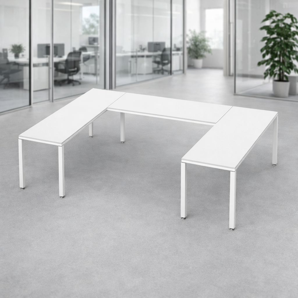 El escritorio en U conformada por 3 escritorios es ideal para un ejecutivo ya que permite una distribución eficiente del espacio, facilita la colaboración con otros compañeros y proporciona un entorno de trabajo versátil que puede usarse para reuniones, presentaciones y tareas individuales, todo al mismo tiempo.