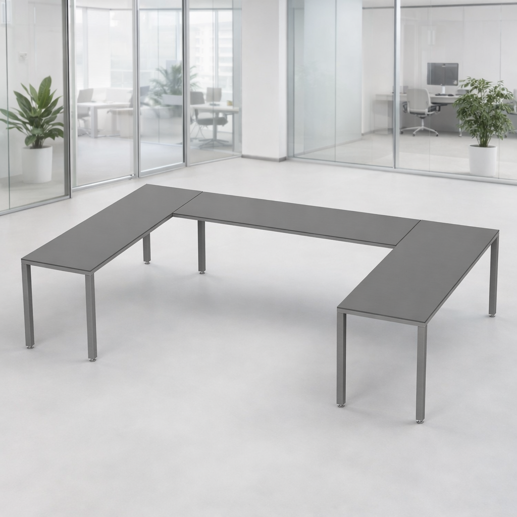 El escritorio en U conformada por 3 escritorios es ideal para un ejecutivo ya que permite una distribución eficiente del espacio, facilita la colaboración con otros compañeros y proporciona un entorno de trabajo versátil que puede usarse para reuniones, presentaciones y tareas individuales, todo al mismo tiempo.