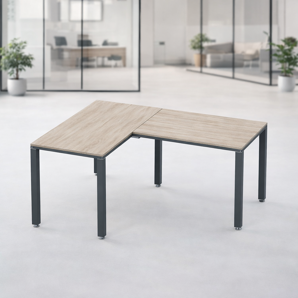 Escritorio en L Billydesk de 120×150 cm, en melamina Encino Polar y estructura metálica Oxford, es un escritorio en L flexible y funcional ideal para oficinas que buscan crecer a bajo costo. Su diseño ofrece dos áreas de trabajo para multitareas, perfectas para atender visitas, manejar papelería o usar equipo especializado como escáneres e impresoras. Una solución práctica y versátil para maximizar el espacio y mejorar la productividad.