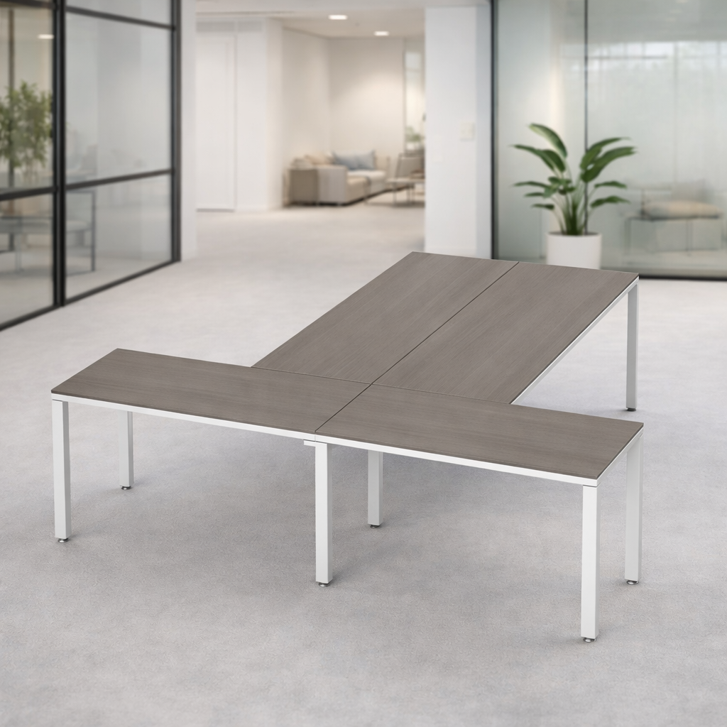 Escritorio en T para 2 personas con melamina color Ceniza y base Blanca es la solución perfecta para oficinas modernas y espacios de coworking que buscan aprovechar mejor el espacio sin perder comodidad. Su diseño favorece el trabajo colaborativo, mejora la organización y crea un entorno dinámico y altamente productivo.