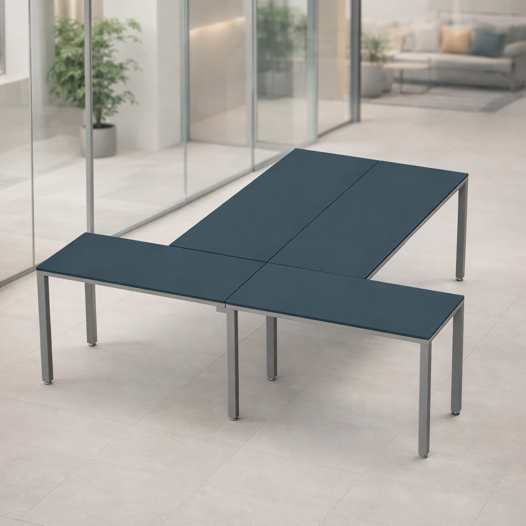 Escritorio en T para 2 personas con melamina color Zafiro y base Oxford es la solución perfecta para oficinas modernas y espacios de coworking que buscan aprovechar mejor el espacio sin perder comodidad. Su diseño favorece el trabajo colaborativo, mejora la organización y crea un entorno dinámico y altamente productivo.