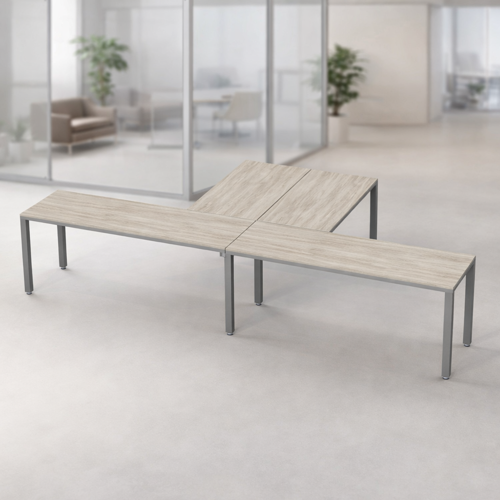 Escritorio en T para 2 personas con melamina color Encino polar y base Oxford es la solución perfecta para oficinas modernas y espacios de coworking que buscan aprovechar mejor el espacio sin perder comodidad. Su diseño favorece el trabajo colaborativo, mejora la organización y crea un entorno dinámico y altamente productivo.