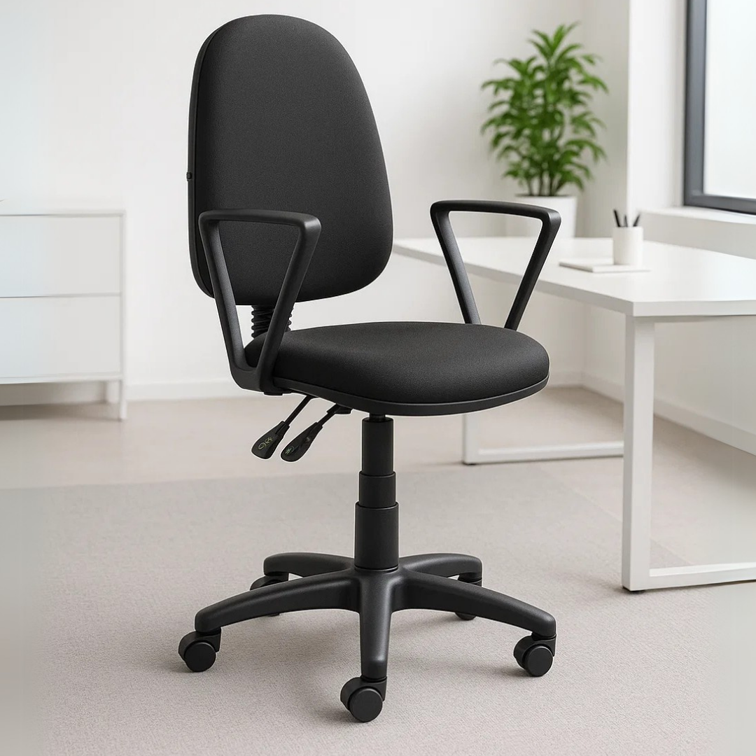 Silla operativa clásica 1512 con brazos y tapizado en tela Mini color negro es una solución cómoda, funcional y resistente para oficinas, estaciones de trabajo o home office. Su asiento acolchado y respaldo bien estructurado ofrecen soporte ergonómico que facilita una postura saludable incluso durante jornadas prolongadas, ayudando a mejorar tu confort y rendimiento diario.